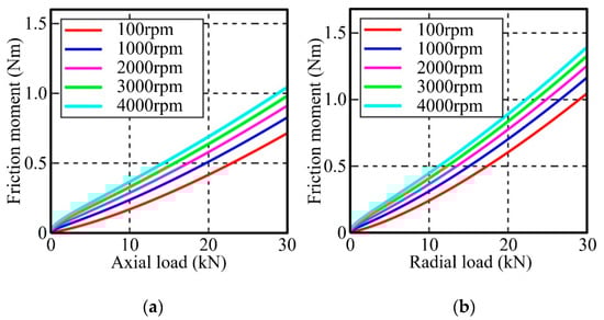 The lubricant chosen for PTRB is lubricating oils for total loss systems L-AN. The pressure–viscosity coefficient is 0.0246 mm2/N, and the dynamic viscosity under normal pressure is 0.04 MPa•s [34]. Under an external load of 0–30 kN and a bearing speed of 100–4000 rpm, the variation of friction torque of the PTRB prototype with external load and bearing speed is shown in Figure 3. The friction torque increased with the increase in external load or bearing speed. Within the range of basic dynamic load rating, MPTRBa ranged from 0 Nm to 1.045 Nm, and MPTRBr ranged from 0 Nm to 1.389 Nm. When the external load was 30 kN, with the bearing speed increasing from 100 rpm to 4000 rpm, MPTRBa increased from 0.715 Nm to 1.045 Nm, and MPTRBr increased from 1.042 Nm to 1.389 Nm.