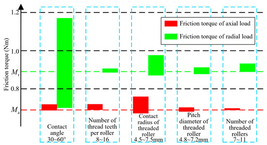 (2) The friction torque increased with the increase in the structural parameter values, with exceptions that MPTRBa decreased with the increase in the number of threaded rollers and MPTRBr decreased with the increase in the number of threaded rollers or the number of thread teeth per roller. The variation of the contact angle had the most significant effect on MPTRBr, and the effect of other structural parameters on friction torque was less than 0.1 Nm.
