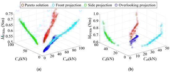 Through the multi-objective optimization design, the axial performance optimization result of PTRB is shown on the left side of Figure 7, and the radial performance optimization result of PTRB is shown on the right side of Figure 7. The friction torque increased with the increase in load rating. Two non-inferior solutions were selected from the two figures in Figure 7, and the structural parameters and performance indexes are listed in Table 6.