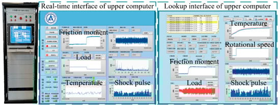 The control system and upper computer interface are shown in Figure 9. The real-time interface of the upper computer is used to display the shock pulse value of PTRB in real time and monitor its health status. It also displays the PTRB friction torque, the load applied to PTRB, and the motor rotation speed in real time, as well as the outer ring temperature. If the PTRB temperature, system friction torque, or load data are abnormal, the buzzer alarm will be triggered. The lookup interface of the upper computer is used to check the test data and images of the temperature sensor, tension and pressure sensor, acceleration sensor, torque sensor, and angle sensor in any time period.