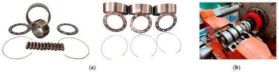 Before the test, all components of PTRB were cleaned and dried with kerosene to ensure the cleanness of PTRB and the frock clamp, as shown in Figure 10. After the assembly of PTRB, the inner and outer rings were rotated manually. If the rotation was smooth without being stuck, the bearing could be defined as a test object, and then a small amount of grease was evenly added, or oil was dropped for lubrication during the test; otherwise, the bearing could not be tested. Then, the inner ring of PTRB was installed on the transmission shaft, and the outer ring of PTRB was installed in the frock clamp, both in an interference fit manner. Running-in was conducted on PTRB under 2 kN, 500 rpm, and 10,000 r. Relatively stable and accurate test data should be guaranteed during the test process.