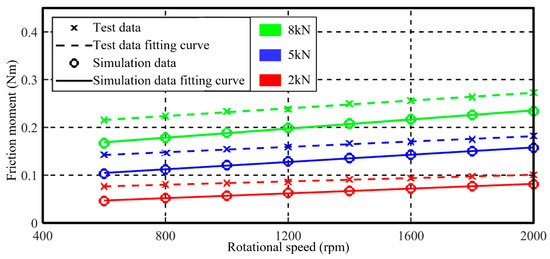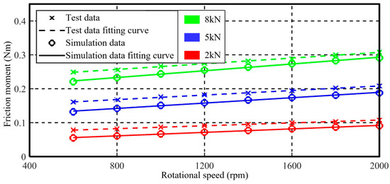 To analyze the effect of the variation of bearing speed on the friction torque of PTRB, a friction torque test was carried out on the PTRB prototype under an external load of 2 kN/5 kN/8 kN and a bearing speed of 600 rpm–2000 rpm. The simulation data and the test data are listed in Table 8. A comparison was conducted between the test data and the simulation data, as shown in Figure 13 and Figure 14. Under the same external load, the variation trend of the test data and the simulation data with the bearing speed was consistent, and an approximately linear increase was seen in friction torque with the increase in bearing speed. Under any bearing speed and external load, the test data were slightly greater than the simulation data, with a deviation of no more than 0.05 Nm.