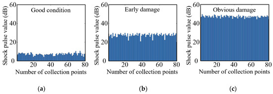 Relationship between shock pulse value and bearing health status. (a) Good condition. (b) Early damage. (c) Obvious damage.