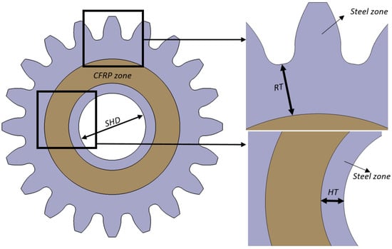 Another significant goal in the industrial sectors, such as automotive, aviation, and machinery, where involute gears are the key transmission elements, is to reduce the amount of fuel usage and, consequently, the CO2 emission rate [5]. The total structural mass of a product is the most responsible factor in the amount of fuel usage. The easiest method of the lightweighting process is to replace the material with a lower density one [6,7]. Most automotive and machine parts subjected to low stresses were previously made from steel but are now made from aluminum, magnesium, or composites [8,9,10]. For gears, usage of these light materials is limited due to higher stress during the power transmission. Gear steel grades are still the most proper options. Indeed, Hertzian stresses occur on the contact zone, as well as bending stress on the tooth root zone for spur gears during operation. Except for these certain zones, the stress levels are quite low [11,12]. For these reasons, a lightweight material can be used for the low stress zone. Mesh stiffness (MS) is another crucial factor for spur gears since it directly affects transmission error and dynamic behavior. Carbon fiber reinforced polymers (CFRP) can be used for the low-stress zone with their high rigidity and good NVH properties. For decades, CFRP materials have been utilized as the material of engineering structures in aerospace, automotive, and other industries [13,14].