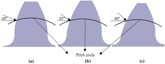 Spur gear tooth with different DSPAs: (a) 20°, (b) 25°, (c) 30°.