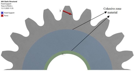 For hybrid gears, it is evaluated that steel and CFRP parts are joined with adhesive bonding. The adhesive is modeled with cohesive zone material (CZM). The CZM method can estimate the strength of adhesive without requiring any initial defect. A well-known fact is that spur gears are planar loaded (bidirectional loading) machine elements during the power transmission [22,29]. These loads result in stresses in the normal and tangential directions for root and joint regions. For this reason, the adhesive is modeled as zero thickness material according to the rule of mixed mode (Mode I + Mode II) condition in the stress analyses. Details of the stress-deformation relation of adhesives can be found in the literature [30,31]. In Table 3, CZM properties are presented.