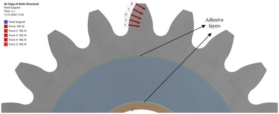 Mesh stiffness is the key parameter for the dynamic performance of the gear systems. Mesh stiffness is related to tooth stiffness directly. In spur gears, the tooth stiffness can be determined as the rate of applied load to total deformation. These deformations are the sum of bending, shearing, compression, and rim and the local Hertz deformations resulting from contact [32]. Deformations are directly related to the stiffness of the gear. These deformations can be obtained analytically [33,34], by the finite element method [35,36] or experimentally [37,38]. In this study, a FE method that is experimentally validated for steel and plastic gears [39,40] is used to evaluate the tooth deformation of hybrid gears. The adhesive bonding zone is modeled with a thickness of 0.25 mm [19]. While the mesh element type remains the same as in the stress analysis, the mesh element size is selected as 0.15 mm in order to involve the effect of hertz deformation [41]. Bonded contact is used between adhesive and CFRP-steel parts. Contact force (F) is defined as 100 N and applied sequentially from different radii along the involute curve on the drive side. The fixed support condition is also identical to stress analysis. The load and support conditions of the deformation analysis are shown in Figure 4.