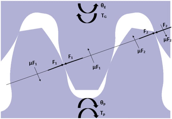 Here, 1 and 2 indicate first and second gear pairs which are in contact position. Jp and Jg are the mass moments of inertia of the pinion and gear, θp and θg angular rotation values, T transferred moment, F dynamic load, ρp and ρg involute radii of curvature, and µ the friction coefficient. The equations of motion with the necessary transformations and damping expression are given below. The equation of motion is presented in Equation (11) while the STE value can be found by using Equation (12). The derivation of these equations can be found in the Appendix A section.