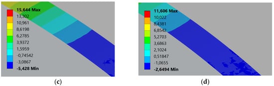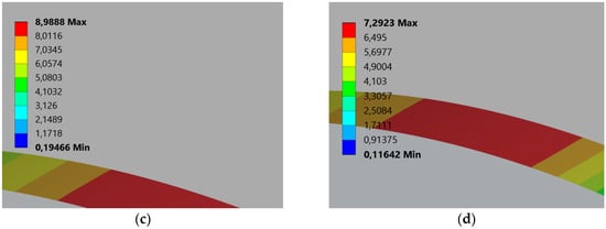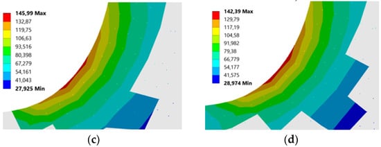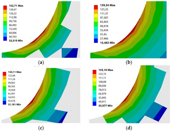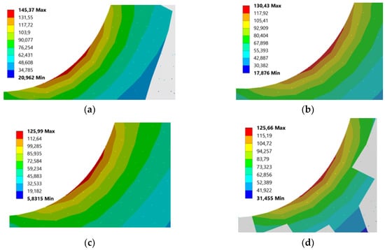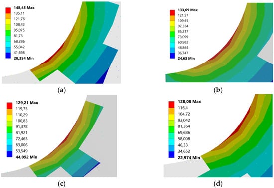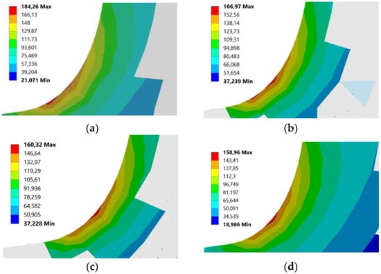 Shear stress results for hybrid gears with αd = 30° for different RTs; (a) 0.5 xm, (b) 1 xm, (c) 1.5 xm, (d) 2 xm.