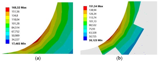 Contrary to normal stress, increasing the DSPA increases the shear stress of the joint region. This is due to the increase in the radial force with the increase in the DSPA. When the DSPA increases to 25° and 30°, the shear stress increases by 6% and 13%, considering all RT values, respectively. In Table 6, stress values of hybrid gears for different DSPAs and RTs are also given for comparison aim in a tabular data.