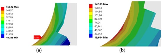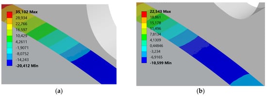 In Figure 17 and Figure 18, the effect of DSPA on root stress of hybrid gears is illustrated for each RT. Please note that results of 20° DSPA are presented in Section 3.1.1.