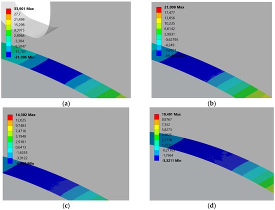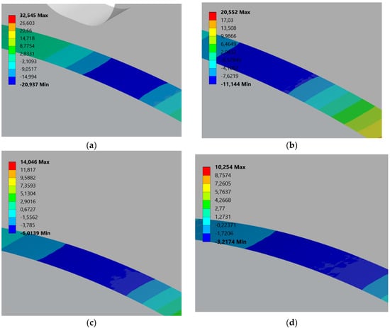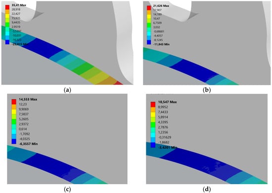 Normal stress results for hybrid gears with αd = 30° for different RTs; (a) 0.5 xm, (b) 1 xm, (c) 1.5 xm, (d) 2 xm.