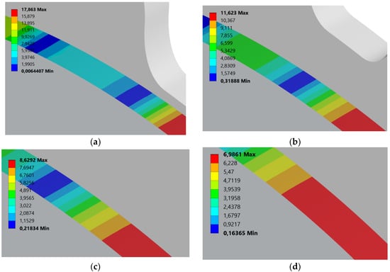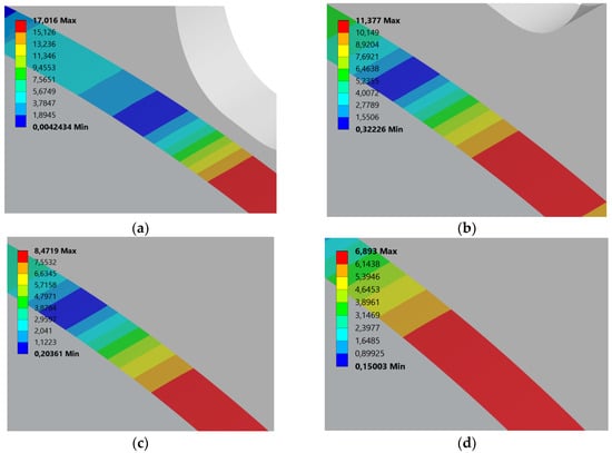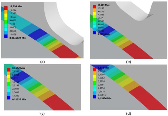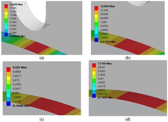 Shear stress results for hybrid gears with αd = 25° for different RTs; (a) 0.5 xm, (b) 1 xm, (c) 1.5 xm, (d) 2 xm.