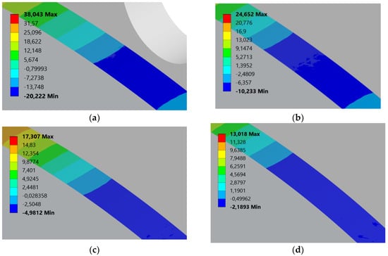 Normal stress results for hybrid gears with αd = 25° for different RTs; (a) 0.5 xm, (b) 1 xm, (c) 1.5 xm, (d) 2 xm.