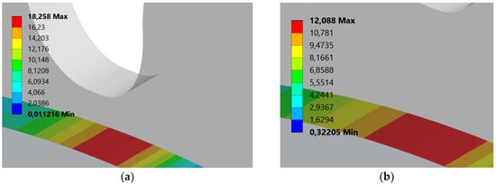 In addition to the normal stress, shear stresses also occur in the joint areas. In hybrid gears, it is very important to determine the stresses in the joint region. These stresses should be lower than the normal and shear strength value of the adhesive. In Figure 14, Figure 15 and Figure 16, the shear stress values of hybrid gears are presented. According to findings, the shear stress values decrease with increasing RT. When the results are examined, shear stress decreases nearly by 15% for each 0.5 xm increment of RT; consequently, the total reduction is 60%. On the other side, rack TR has a modest effect on joint shear stress. The maximum shear stress is 17.863 MPa for ρ1 = 0.1 xm. When the rack TR becomes 0.3 xm, this stress results decrease by only 2% for 0.5 xm RT. The rack TR effect is decreased with increasing RT. For 2 xm RT, the difference between stress levels decreases by 0.6%.