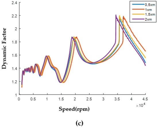 As the number of revolutions increases, dynamic loads begin to be effective on the gear in the gear mechanisms. The determination of these dynamic loads according to the number of revolutions is rather significant in gear mechanism design [42]. In addition, minimization of dynamic loads is required, especially at a high number of revolutions. In gear dynamics, the concept of dynamic factor is generally used to explain the dynamic behavior of the gear pairs. The dynamic factor is the ratio of the maximum dynamic load to the static load during a cycle [43,44,45]. On the other side, STE is accepted as a primary cause of vibration and noise in gear systems. STE is also one of the most significant indicators for the performance evaluation of gear pairs [18,46]. The 2-DOF model is used to examine the hybrid gears’ dynamic behavior in the current study. Dynamic factors in the range of 100–45,000 rpm are found for each gear type, and static transmission errors are obtained for 1 rpm number of revolution. The equations of motion in the 2-DOF system are obtained from the free-body diagram in Figure 6.