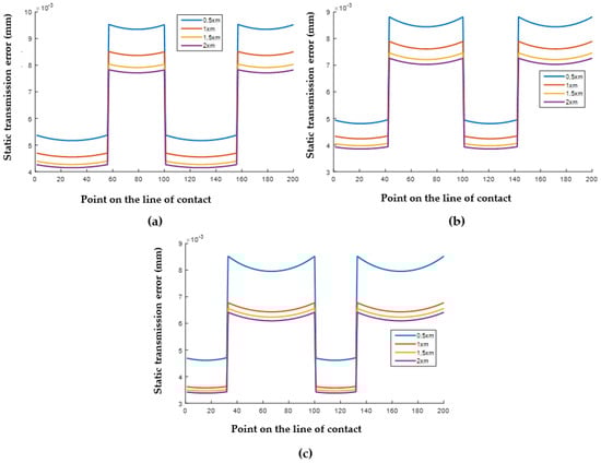 STE results of hybrid gears with different DSPAs: (a) 20°, (b) 25°, (c) 30°.