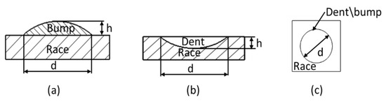 The leading cause of bumps in REBs is the presence of debris between the rolling element and the raceway. The debris may be lubricant impurities or induced by fatigue spalling. The profile of bumps on the raceway is approximated as a hemisphere, as shown in Figure 2a [6,45]. On the other hand, debris particles, brinelling, and surface spalls are the leading causes of dents on bearing raceways. The basic geometry of a dent can be idealized as a hemispheroidal shape, whose size is defined by diameter d and depth h, as shown in Figure 2b [52,53].