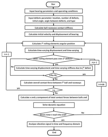 A deep-groove ball bearing (6205-2RS JEM SKF) is used in this study, and its geometrical specifications are listed in Table 1. The bearing shaft is selected to rotate at 1797 rpm under zero external load in the simulation environment. Moreover, the simulation time step is 6 µs, and the initial displacement of the inner race is 1 µm in the x- and y-directions, while the initial velocity is 0 in the horizontal and the vertical direction [59].