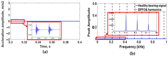 (a) Simulated acceleration signal of healthy bearing and (b) envelope spectrum of simulated acceleration signal.