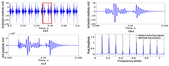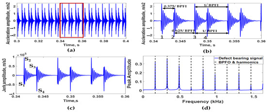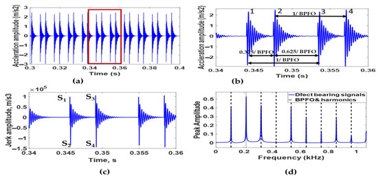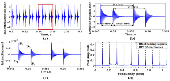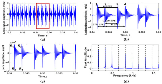 (a) Simulated acceleration signal of bearing with two dents on its outer race at an angle of 25°, (b) simulated acceleration signal between 0.34 s and 0.36 s, (c) simulated jerk signal in time domain, and (d) envelope spectrum of simulated acceleration signal.