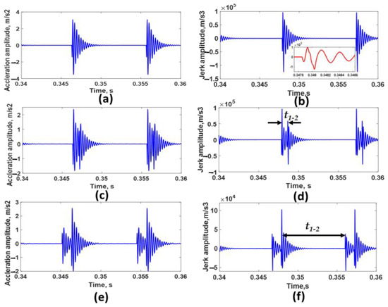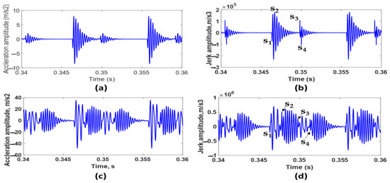 In Figure 9a,b, the two transient impulses generated during the passing of the rolling bearing over the two defects are merged due to the small value of the angle between defects (0.415°). Hence, it is difficult to identify the presence of double defects by relying only on the interpretation of the acceleration signal. By differentiation, jerk-induced vibrations due to the entrance and exit event of the bump and dent are clearly noticed. Therefore, it is necessary to use a jerk signal for recognizing the occurrence of double defects, especially when the angle between defects is small.