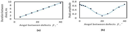 Figure 10a indicates the relationship of the time interval between the ending and beginning of destressing impulses t1–2 measured from the jerk signal and the angle between the two defects. It can be seen that t1–2 increases linearly with the increasing angle between defects, and this is for an angle less than the angle between two adjustment balls. Therefore, the angle between the two defects β can be calculated from Equation (22) as follows: