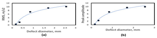 A ball bearing model with bump and dent defects on its outer raceway is considered for studying the effect of changing the defect diameters on the vibration response of the bearing. The bump has a height of 0.1 µm, while the dent has a 0.27 mm depth. The bump location is the intercept between the x-axis and outer raceway at the heavily loaded zone, and the angle between defects is 15°. The defect diameter values vary from 0.17 mm to 2.5 mm. The bearing model is made to run at 1797 rpm. The simulation results are given in Figure 11.