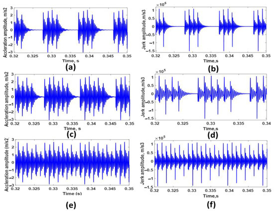 Dynamic response (acceleration and jerk) of a bearing has multiple bumps and dents on its outer race with 5° angle between every two defects: (a,b) 4 defects, (c,d) 6 defects, and (e,f) 8 defects.