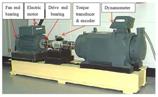 The verification of the proposed ball bearing dynamic model is conducted using defective bearing test data provided by the Bearings Data Center at Case Western Reserve University (CWRU) [65] using the test rig shown in Figure 15. A 2 hp electric motor is used to drive a shaft on which torque is applied via a load motor. Individual localized faults are generated at the surfaces of the inner raceway, outer raceway, and balls of motor bearings via electrical discharge machining (EDM). Vibration acceleration data are measured at locations near to and far off the motor bearings at a 12 kHz sampling frequency. The results of vibration characteristics for each faulty bearing with different fault sizes and locations are used as a benchmark. Hence, comparisons between the advanced fault identification methods can be easily held.