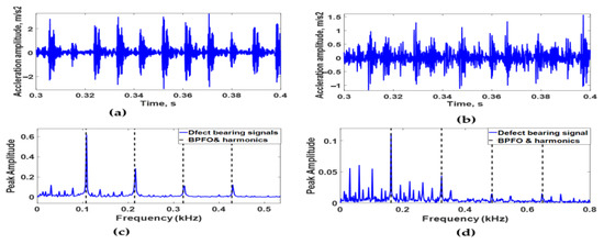 When comparing the dynamic response of a healthy bearing and a defective one, which are shown in Figure 4a and Figure 5a, it is clear that the vibration signal exhibits periodic transient impulses with remarkable amplitudes, depending on the size and shape of faults. The normal bearing, on the other hand, shows transient periodic impulses due to fluctuations of resultant dynamic force (Fx, Fy, Fdx, Fdy) [62]. The envelope spectrum of healthy and defective bearings, which are shown in Figure 4b and Figure 5d, respectively, reveals that BPFO and its harmonics are dominant modulation components for both bearings. Furthermore, the peak amplitude at BPFO frequency and its harmonics for the healthy bearing is insignificant compared with peaks for the defective one.
