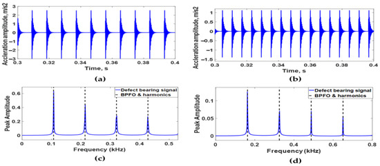 Experimental acceleration signals of ball bearings have a defect on the outer raceway in one case and the inner raceway in other cases, as shown in Figure 16a,b. It is clear that periodic impulses occur due to the passing of rolling elements above a dent in the two cases. In addition, the average time delay between two consecutive impulses is 9.3 ms when the dent is located in the outer raceway. However, 69 ms is the average time delay between the acceleration signals of the bearing that has a dent in the inner raceway. In addition, Figure 16c,d indicates the envelope spectrum of experimental signals in both cases. It is obvious that the peak amplitudes occur at ball bass frequency on the outer race, which equals 107.9 HZ, and it is harmonic when the dent is located in the outer raceway. Meanwhile, in the case of the dent located in the inner raceways, the highest peak amplitude occurs at 162 Hz, which is equal to the ball bass frequency on the inner race. In addition, the other beaks occur at the harmonics.