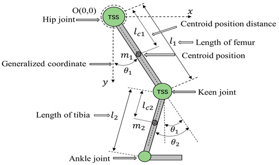 The Newton–Euler method and the Legrangian formulas have been used to discover the dynamic model of the system by preceding researchers [29]. The behavior of the lower limb exoskeletons model can be effectively described with the aid of Lagrangian approaches. The dynamic equations for the hip and knee joints in the sagittal plane can be derived from the Lagrangian method. Figure 1 shows a schematic diagram of the simplified mechanical structure of the lower limb exoskeleton, where each leg consists of 3-DOF and the DOF of the ankle is passive. The dynamics of the model are also depicted in Figure 1; the hip and knee angles are considered to be and , respectively.