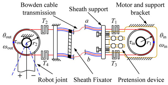 The schematic diagram of a double tendon–sheath. In the figure, tendons a and b are attached to the input side pulley and output side pulley with a pull-pull configuration and are the input and output torque, and are the input and output angles, and are the angular velocities of input and output, and and are the radius of the pulleys. The tendon transmits the force and torque by mechanical displacement in the inner tendon.