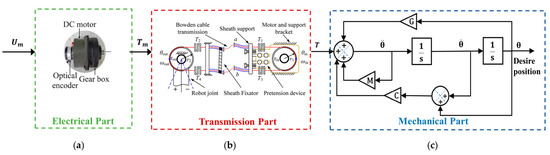 Figure 3 demonstrates the basic structure of the CLLE, including the electrical part, transmission part, and mechanical part. In Figure 3, represents the input voltage of the DC motor, is the input torque of the transmission system, and represents the torque applied on each joint. In this paper, the discussion mainly focuses on the controller that eliminates the negative friction effects, so the details of the electrical part will not be analyzed.
