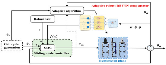Sliding mode controllers (SMC) are popular in robotic control systems [36]. In this section, a robust adaptive SMC with an RBFNN algorithm compensator was introduced to eliminate the effects of uncertainties and friction in the CLLE. The universal approximation characteristic of RBFNN was utilized to enable SMC to implement enhanced performance. Figure 4 shows the scheme of SMC with the compensator.