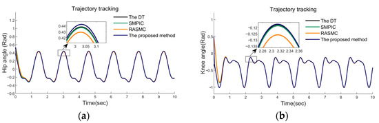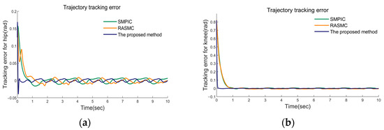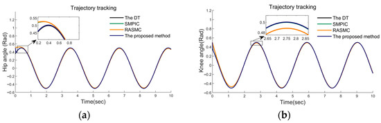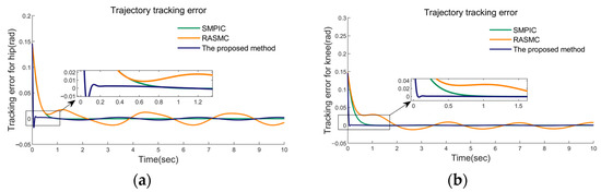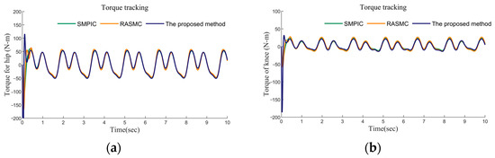 Case Ⅰ: In this case, the tracking performance of the three controllers without uncertainties and frictions was simulated. The desired gait trajectories were obtained from clinical gait analysis [38], and the results are exhibited in Figure 9, Figure 10 and Figure 11. In this condition, all three control methods enable achieving effective trajectory tracking. Figure 9a,b clearly stated that our proposed method, SMPIC and RAMSC can achieve different gait trajectory tracking. From Figure 10, it can be concluded that the convergence of the tracking errors of the proposed method and SMPIC are superior to RASMC. In Figure 11a,b, the time histories of the control torque of hip and knee joints have been given. The input torques of three methods were smooth and can achieve soundtracking of the control torques. In conclusion, all three methods can achieve soundtracking control of the desired gait trajectory, irrespective of uncertainties and disturbances.
