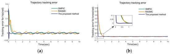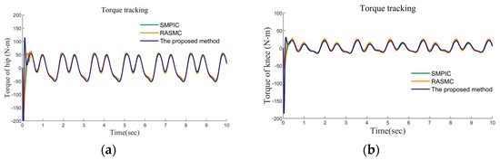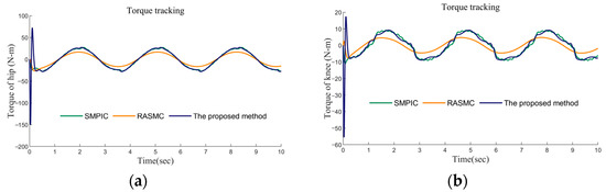 Case 0: The performance of the three controllers on gait tracking in 2−DOF CLLE under uncertainty and friction was observed. The corresponding simulation results, in this case, have been exhibited in Figure 6, Figure 7 and Figure 8 (only 0–10 s are exhibited). In Figure 6, the temporal response of the angular position of the hip and knee joints is shown. The simulation results revealed that our proposed method and SMPIC present slightly better accuracy than the RASMC in tracking the desired gait trajectories. Meanwhile, the control effects and response speed of our proposed method are superior to RASMC and SMPIC. In Figure 7, the tracking errors of the angular position of the hip and knee joints are exhibited. The proposed method possesses smoother convergence in both hip and knee joint control compared to RASMC and SMPIC. In Figure 8a,b, the time histories of the control torque of hip and knee joints have been given, which revealed that the peak input torque varies for different control algorithms.