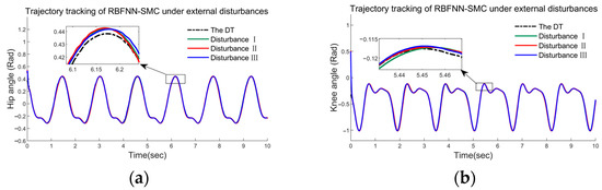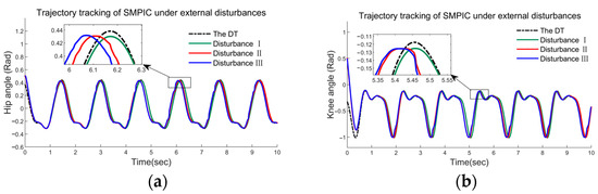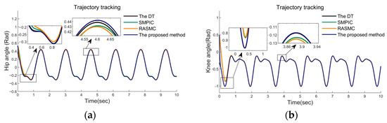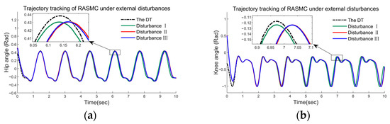 Case Ⅲ: In this case, to verify the robustness of the three methods, a set of comparisons between SMPIC, RASMIC, and the proposed controller in the presence of three different amplitudes of external disturbances were introduced. The data are shown in Figure 16, Figure 17 and Figure 18. As displayed in Figure 16 and Figure 17, the RASMC and SMPIC have shown an obvious deterioration in tracking performances as the external disturbances increase. However, in Figure 18, our proposed controller can still maintain an acceptable tracking control for desired gait trajectories even under such bad uncertainties and disturbances. This phenomenon validates the sound robustness of our proposed method to uncertainties and external disturbances, which is extremely necessary for engineering practice; as a bottom line, the proposed method must be in a position to preserve its robustness even under the worst influence of uncertainties.
