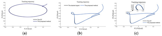 2-D trajectory tracking of the hip and knee joints. (a) 2-D trajectory tracking of the hip and knee under case 0; (b) 2-D trajectory tracking under case 1; (c) 2-D trajectory tracking under case 2.