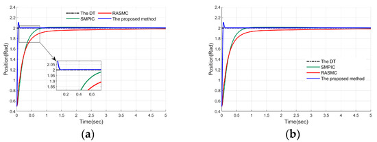 Finally, a step–response experiment was implemented to evaluate the stability and response speed of the proposed controller compared with SMPIC and RASMC. The experimental results are shown in Figure 19a,b. The results show that the proposed method responds quickly, and the tracking error can converge to zero in a relatively short period of time. As shown in Figure 19, the performance metrics, such as delay time and the rising time of the proposed method, are in the range of approximately 0.1 to 0.2 s, while both SMPIC and RASMC are at 1 s or above.