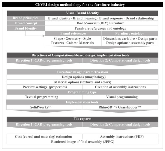 Figure 1 illustrates the proposed CbVBI design methodology used to create specific branded pieces of furniture. The workflow is divided into three different sections. The first section of CbVBI deals with the branding elements and references specification. The Do-It-Yourself (DIY) branding theme relates to the furniture ontology (e.g., dimensions variables, design, assembly parts, etc.) [19]. The implementation of the design procedure forms part of the second section of the workflow. More specifically, the second step is composed of two parallel directions: (a) designing with CAD programming tools (textual programming) and (b) designing with computational tools (graphical algorithmic design). These directions are considered in the following procedure according to the digitalized furniture design parametrization: (a) the designer creates the design options according to the furniture ontology, which is related to the object’s morphology, and (b) a material database is created by the designer in order to offer the aesthetic parameters in the design procedure of customizing DIY furniture with a 3D-rendered representation. The final section involves the digital export of the new furniture ideas created from the end-users’ point of view (e.g., rendered images, assembly instructions, etc.). The basic objectives of the CbVBI methodology (as the final result of the research) are summarized in three specific directions: (a) the parametrization of the branding criteria (visual elements), (b) the digitalization of the product development according to computational strategies and finally, (c) the automatization of the product development.