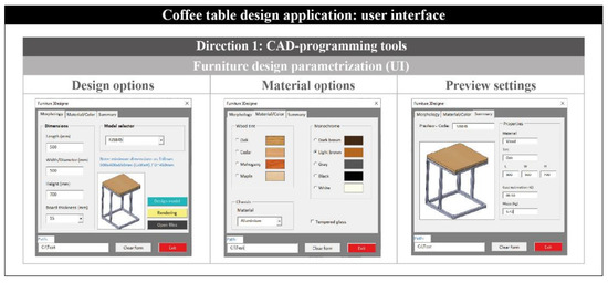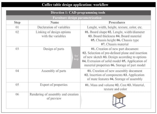 In this case study, a typical example of CAD-based programming is presented, in relation to the design and assembly of a coffee table. Such furniture is common in coffee shops and cafeterias, as well as in similar shops. Despite the fact that this paper does not focus on the design aspect of the product, but rather on the implementation of CAD-based programming for the design procedures, it must be noted that these tables are usually compact, lightweight, somewhat tall and sturdy to allow them to be carried easily, take up only a small area and provide adequate ergonomics for the user. The user interface is considered to be the bridge between the user and the CAD system [20]; therefore, it is important that it is clear and understandable, as well as easy to navigate.