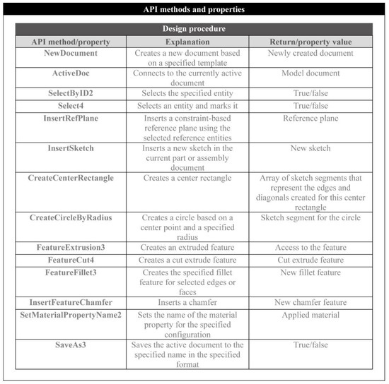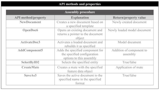 During the stage of the assembly process, a new assembly document is opened and all the parts that comprise the assembly are opened in the background. The “ActivateDoc3” and the “AddComponent5” methods are responsible for the activation of the newly created document and the insertion of each one of the opened parts into this document. “SelectByID2” is used in this stage as well for the same purpose: to select the already named entities for the application of the mate features with the “CreateMate” method. As has been already discussed, it is important that the parts are designed with predefined planes and other geometric entities in order to facilitate the mating process during the assembly of its components. The most commonly used API methods are shown in Figure 5.