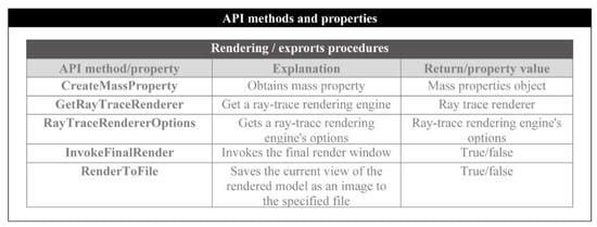Figure 6 includes the necessary methods and properties for the export of the product’s properties, as well as the realization of the rendering. The method “CreateMassProperty” calculates the mass and volume of an individual part or an assembly by utilizing the physical properties of the applied material. Therefore, this method functions only if a material is set for each of the components.