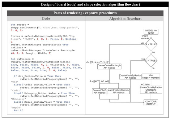 According to Figure 3, the code follows a straightforward execution. First of all, the necessary variables, relating to the dimensions, the material and the color, are declared. Next, these variables are linked to the corresponding design options that are available in the interface. For instance, when the user types a number in the “Length (mm)” field, the variable that corresponds to the length of the board changes its value to the typed one. As soon as the user pushes the “Design model” button, the design process begins. Therefore, the design loop is executed for every part comprising the table. This number varies depending on the selected design options. Regarding the design procedure, the creation of a new part document, the selection of a plane, the insertion of a new sketch, the design of a contour, the extrusion of a solid model, the application of a material texture/color and the storage of the model are tasks that are performed on every iteration of the loop. The only difference is that the contour sketched on each iteration varies according to the part being designed. Hence, a rectangle/square, a rhombus or a circle will be sketched for the design of the board. Similar shapes will be sketched for the design of the chassis parts. To facilitate the design code for the sketched contours of the parts, the “If-Then-Else” structure was used.