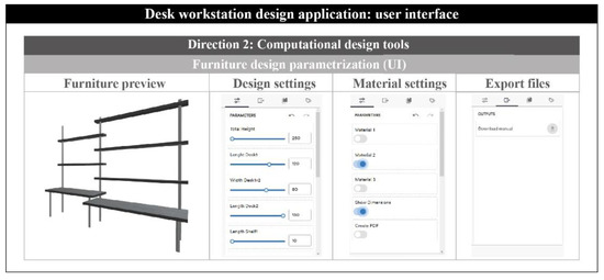 The present application is divided into three different design areas, as seen in Figure 8. The first area includes all the important parameters according to the design options (e.g., basic dimensions of the furniture, number of parts, etc.). Some of the design options are the total height of the product (TH), the length and the width of Desk1&2 and the number of the shelves (LS1 to LS5). Similar to the previous case study, the second area includes a number of options for the material and texture of the furniture. All the materials and skin types are related to wood textures. Finally, the third area provides the export files for the assembly instructions and the rendered representations of the final DIY furniture.