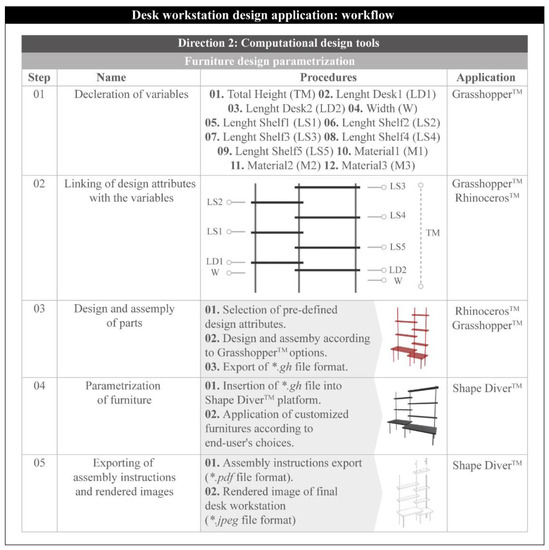 Graphical algorithmic editors are important for developing parametric designs through visual programming [21]. The numerous designs that are generated by the proposed CbVBI application are digital forms of a desk workstation. This procedure was based on GrasshopperTM and Rhinoceros3DTM software in order to offer a fully useful design application for branded furniture under the concept of DIY [22].