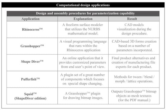Figure 10 summarizes the group of the applications, pieces of software and add-ons that were used for the development of the CbVBI application. Apart from the aforementioned software GrasshopperTM, Rhinoceros3DTM and Shape DiverTM, the authors used two kinds of special add-ons for the application implementation.