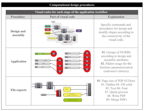 Figure 11 presents parts of the visual codes for each stage of the application workflow. More specifically, the whole code is divided into three programming areas: (a) design and assembly of the furniture, (b) application for the end-user’s design contribution and (c) export files. The first area of the graphical algorithm includes the necessary methods and properties for the design and assembly of the product’s morphology. At this stage, the designer is able to create the parts of furniture according to GrasshopperTM’s commands and procedures. Three kinds of parameters define the design procedure: the number of parts, type of parts and part specification.